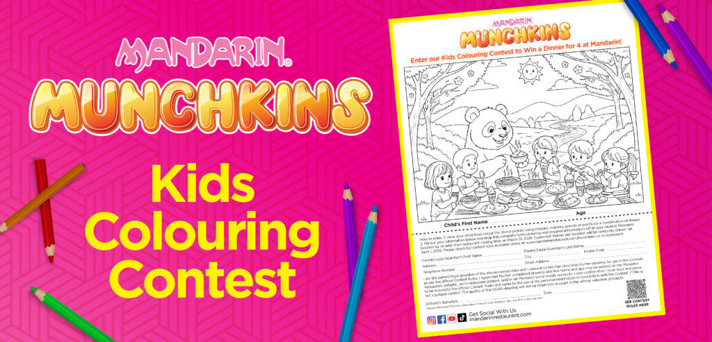 Have a little artist at home? Enter our Munchkins Kids Colouring Contest to win a Dinner for 4! Click Here to download and print the colouring sheet at home and drop it off at your nearest Mandarin location by March 31, 2026. For full Contest Rules, please visit here.